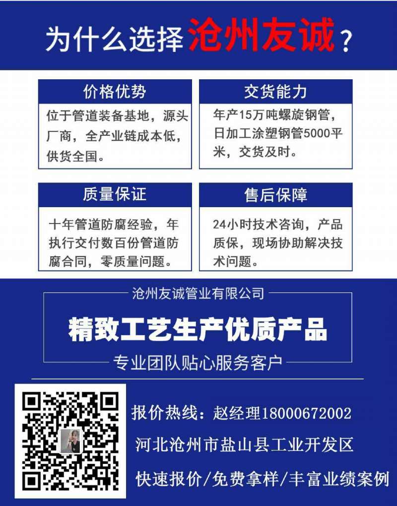 ,我們本著誠實守信的經(jīng)營理念,嚴(yán)把產(chǎn)品質(zhì)量關(guān);開拓創(chuàng)新,努力完善產(chǎn)品生產(chǎn)技術(shù)。希望通過我們的努力,借助您的支持,讓我們共同譜寫友誠美好的明天。友誠管業(yè)把握真人性,洞悉真人心,成就真人生.首選滄州友誠管業(yè)有限公司,